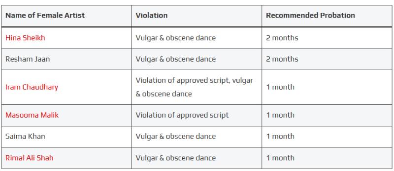 رپورٹس کی بنیاد پر ان چھ اداکاراؤں کے خلاف کارروائی کی منظوری دی گئی، جس کے بعد پنجاب کونسل آف دی آرٹس کو پابندی کے احکامات جاری کرنے کی ہدایت کی گئی۔
