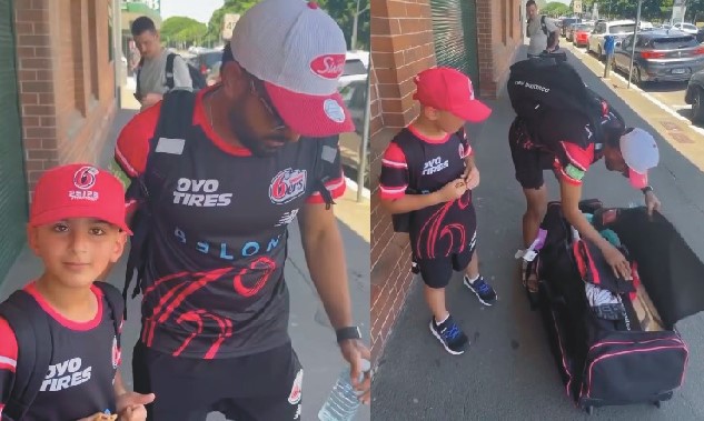 اس دوران بابر نے کٹ بیگ کھولا اور اپنے دستانے بچے کو تحفے میں دے دیے جس کے بعد ننھا فین خوش ہوگیا۔
