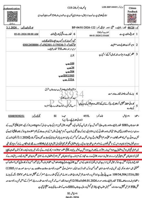 ایف آئی آر کے مطابق ہفتے کی رات کو شالیمار باغ میں سرکاری ادارے کے تحت ثقافتی شو ہوتا ہے ۔ اس میں قوال فراز خان نے گانا گایا ” جیل اڈیالہ، قیدی 804 ہووے”, جس کی وجہ سے عوام میں اشتعال پیدا ہوا۔