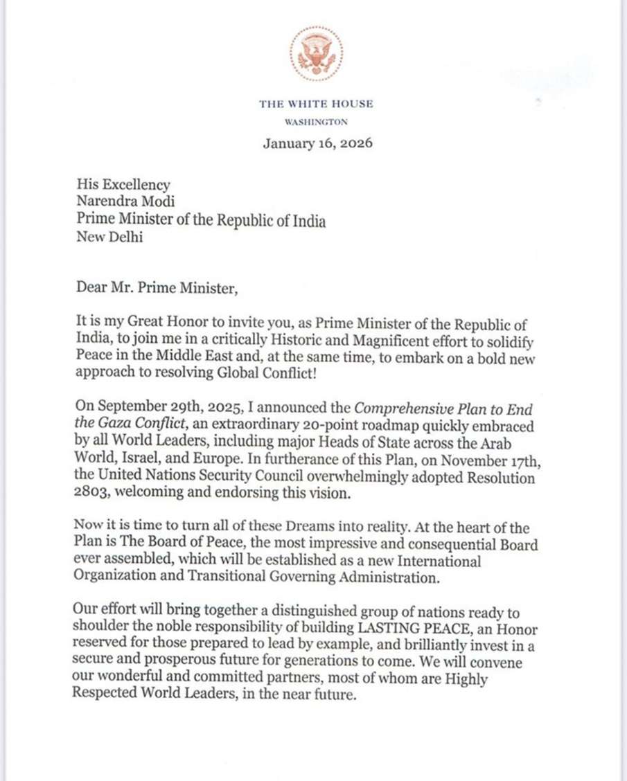 خبر رساں ایجنسی اے این آئی کے مطابق صدر ٹرمپ نے غزہ بحران کے حل کے لیے بھارت کو ’بورڈ آف پیس‘ کا حصہ بننے کی پیشکش کی ہے۔ بھارت کے اسرائیل اور فلسطین دونوں کے ساتھ تاریخی تعلقات ہیں اور حالیہ تنازع کے بعد بھارت مصر کے راستے غزہ کو انسانی امداد بھی فراہم کر رہا ہے۔