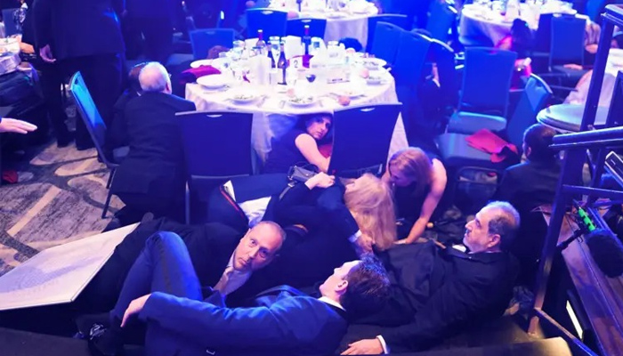 امریکی میڈیا کے مطابق ہلٹن ہوٹل میں منعقدہ عشایئے کے دوران زور دارآواز سنی گئی، سکیورٹی خدشے کے باعث مختصر وقت کیلئے ہلچل مچ گئی۔اس دوران سیکریٹ سروس اہلکار صدر ٹرمپ کو عشایے سے باہر لے گئے۔